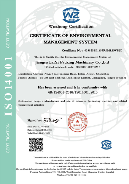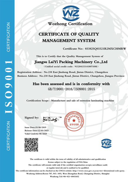 चीन JIANGSU LAIYI PACKING MACHINERY CO.,LTD. प्रमाणपत्र